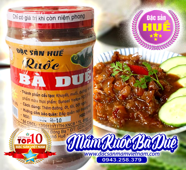 Mắm Ruốc Huế Bà Duệ Được chế biến từ con tép biển tươi ngon, mắm ruốc Bà Duệ là thứ gia vị không thể thiếu trong chế biến các món ăn, đặc biệt là món bún Huế. Ngoài ra, mắm Bà Duệ còn dùng để chấm thịt luộc, làm mắm ruốc xào xả ớt….